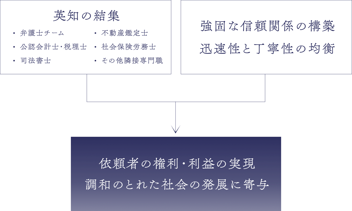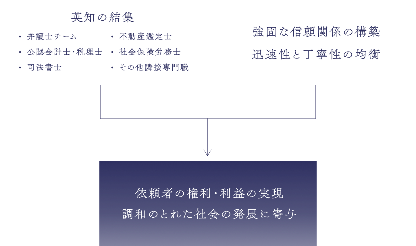 以上のような業務体制・理念のもと、依頼者の権利・利益を実現しつつ、調和のとれた社会の発展に寄与することが、法曹としての我々に与えられた使命だと考えております。